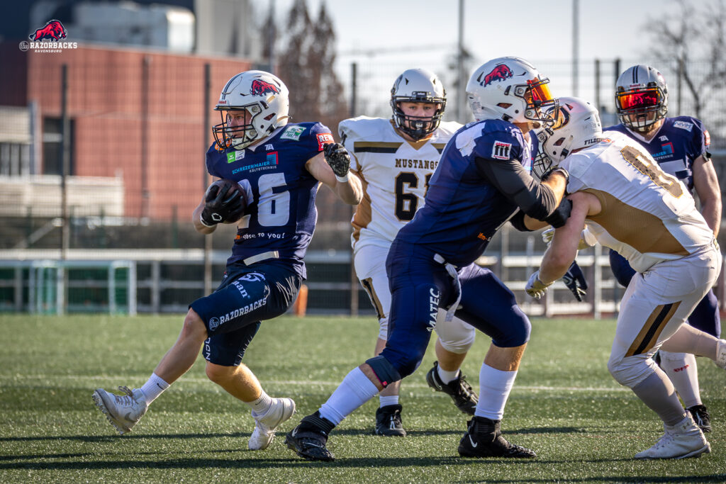 Die Partie begann vielversprechend für die Razorbacks. Nachdem die Defense der Gastgeber den ersten Angriff der Mustangs schnell stoppte, setzte Running Back Seraphin Stuparek direkt ein erstes Ausrufezeichen: Ein spektakulärer 80-Yard-Touchdown-Run wurde jedoch durch eine Strafe zurückgenommen. Kurz darauf folgte eine Interception der Mustangs Defense, die den Schwung der Ravensburger zunächst bremste.