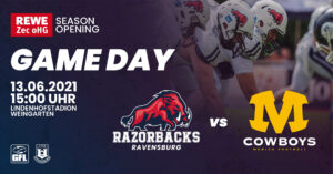 Diesen Samstag ist es endlich soweit und die Tore des „Razordomes“ in Weingarten öffnen sich für die neue Saison der GFL2. Das Vorbereitungsspiel am 08.04.17 gegen die Karlsruher Kit Engineers beginnt um 15 Uhr. Rund um das Spiel haben wir tolle Eröffnungs-Events für euch und die Kids vorbereitet:
