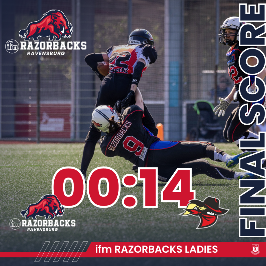 Der zweite Turniertag der Damenaufbauliga Süd begann mit dem Duell zwischen den Razorbacks Ladies und den Dachau Thunder Ladies. Beide Teams lieferten ein spannendes Spiel und nach zwei Hälften mit jeweils zehn Minuten stand es immer noch 0:0, was in die Verlängerung führte. Die Ausgeglichenheit der Kräfte und die starke Leistung beider Defensivmannschaften prägten das Spiel. Trotz zahlreicher Chancen und langanhaltender Drives gelang es den Ravensburger Spielerinnen jedoch nicht, Punkte auf das Scoreboard zu bringen.