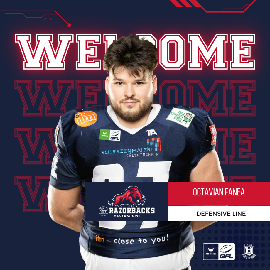 Auch der Kanadier Octavian Fanea verstärkt das Team der IFM Razorbacks. Der 23-Jährige kommt aus Windsor (Ontario) und spielt seit seinem zehnten Lebensjahr Football. Mit den St. Clair Saints gewann er im letzten Jahr die OFC Meisterschaft und bringt somit auch Erfolgserlebnisse in das Team der Razorbacks ein. Als schwerer und robuster Defense-Liner wird er der Verteidigung der Razorbacks zusätzliche Stärke verleihen.