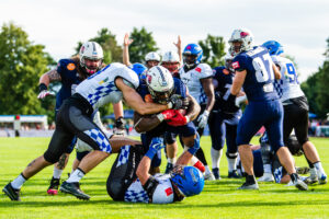 Auch die Verteidigung war hellwach und konnte ein ums andere Mal den Saarländer Angriff stören. So war es Hélio Barros Lima, der den Saarländer Quarterback früh zu Fall brachte. Überhaupt baute die Defensive-Line gekonnt Druck auf und Ben Rashid sammelte an diesem Tag drei weitere Sacks. Gleiches gilt für das Backfield. Niklas Herrmann fing im ersten Drive der Gäste einen Pass ab und brachte die Oberschwaben in Ballbesitz. Schnell wurde klar, das Projekt Playoff rückte in greifbare Nähe.