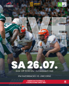 Dabei müssen die ifm Razorbacks weiterhin auf die beiden gesperrten Spielen Yannik Oswald und Dexter Shea verzichten. Ansonsten konnten die Ravensburger die spielfreie Woche für die Regeneration und ausgiebige Vorbereitung auf den anstehenden Gegner nutzen. „Wir denken von Spiel zu Spiel. Für uns ist es wichtig, dass wir vier Quarter konzentriert Football spielen. Dann können wir jeden Gegner schlagen“ so Headcoach John Gilligan über die anstehende Aufgaben.