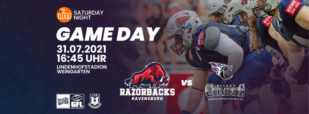 Einlass zum IFM Saturday Night Game am 31.05.2021 ist ab 14:30 Uhr. Der Kickoff erfolgt um 16:45 Uhr. Tickets sind nur online erhältlich unter https://ravensburg-razorbacks.de/tickets/.Eine Tageskasse wird es nicht geben.