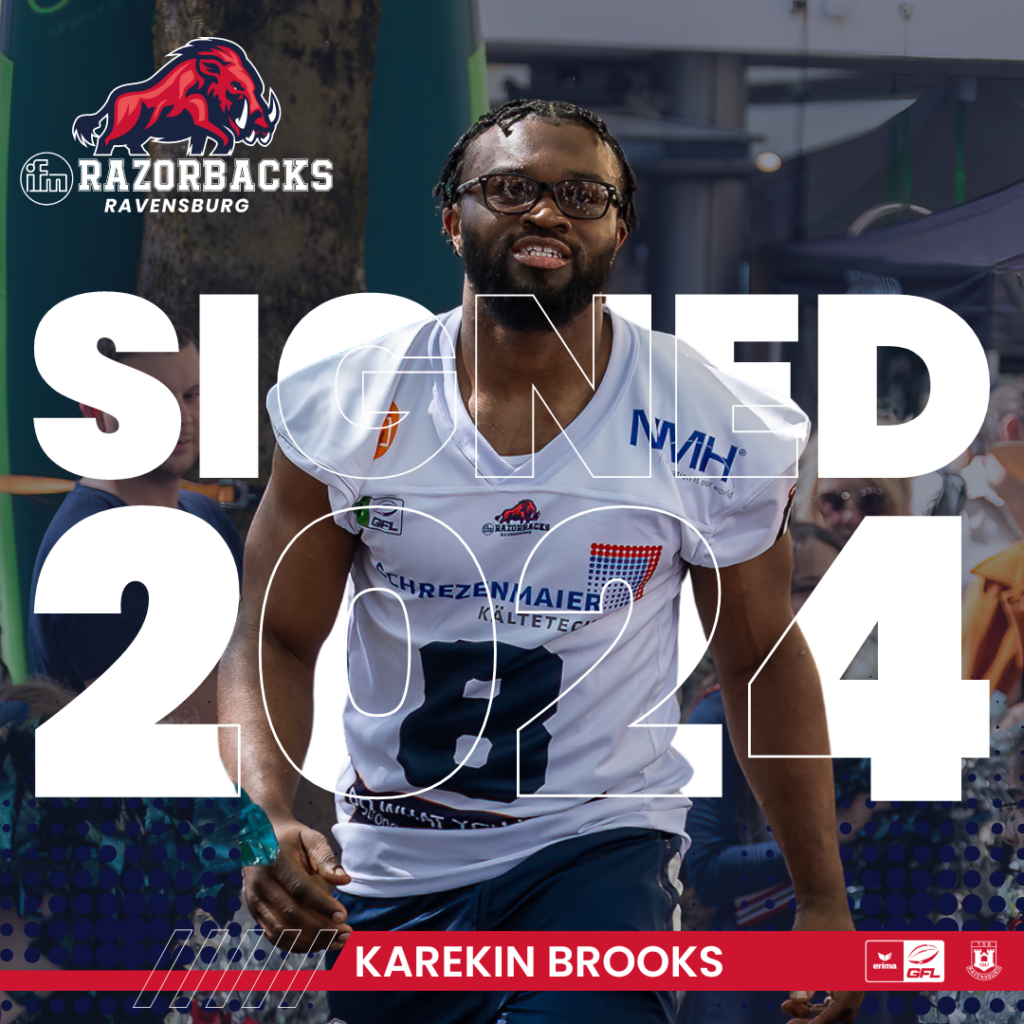 Für den Angriff schlüpft Karekin Brooks ins Trikot der Razorbacks. Der US-Amerikaner spielte an der University of Pennsylvania in der Ivy League, einer im engeren Sinne NCAA Division I Liga. 2019 führte er die Liga mit über 1.000 Rushing-Yards in nur neun Spielen an. Seine Universitätskarriere beendete er als Drittbester Rusher mit insgesamt 2.847 Yards und als Zweitbester in der Kategorie „Yards per Carry“ (5,5 Yards/Carry). Nach seinem Wechsel zu den UWE Bullets in England gewann Brooks mit dem Team die National Championship und wurde zum wertvollsten Spieler gewählt. Mit Brooks erhalten die Razorbacks neben Lennies McFerren einen weiteren erfahrenen Spieler, der den Wildschweinen die einen oder anderen Yard bescheren wird.