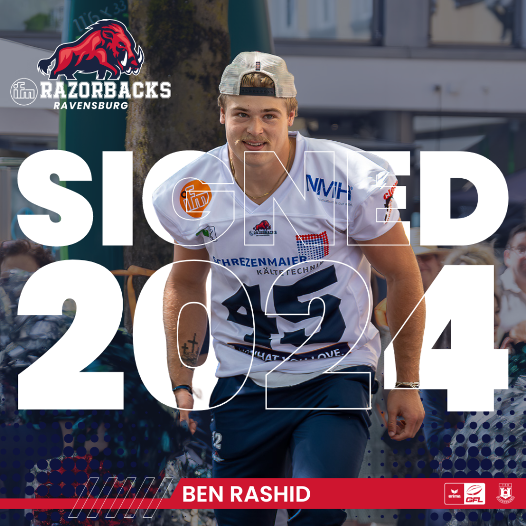 Weiter verstärken zwei Spieler aus dem Mutterland des Footballs die Wildschweine. Für die Verteidigung kommt Ben Rashid nach Oberschwaben. Der Defensive Back spielte die letzten Jahre für die Spartans der University of Dubuque (Iowa). Dabei gingen 20 Solo-Tackles sowie 9,5 Sacks auf das Konto des 108 kg schweren Verteidigers.