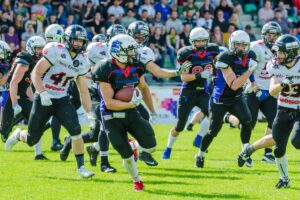 Das war auch bitter nötig. Zwar waren die Ravensburger durch Finn Kearns und Yannic Oswalds Kick mit 7:0 in Führung gegangen. Doch in der Defensive stimmte anfangs überhaupt nichts. Spencer Payne und Yannick Rust erzielten die Touchdowns für die Beavers. Andrecus Lindley brachte die Razorbacks mit zwei Touchdowns mit 20:14 in Führung. Doch Alexander Funk, Christian Petrich mit einem Field Goal und erneut Payne punkteten für Biberach – zur Pause stand es 30:20 für die Gäste. „Wir hatten einen guten Plan und haben hart gekämpft“, meinte Biberachs Spielertrainer Oscar Vazquez-Dyer. Der Höhepunkt aus Biberacher Sicht war eine Interception – ein abgefangener Pass des Quarterbacks – von Payne in der eigenen Endzone inklusive 90-Yard-Lauf.