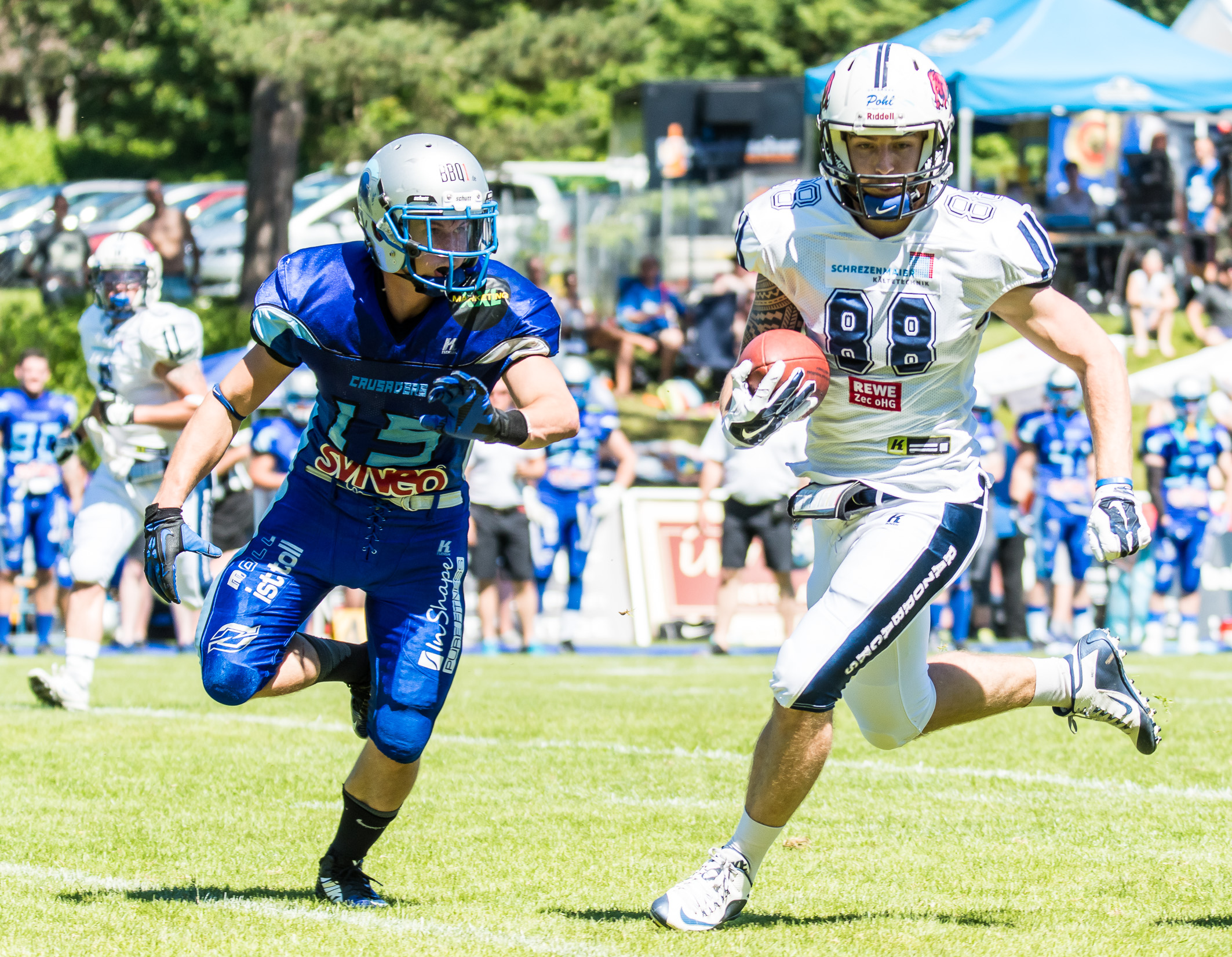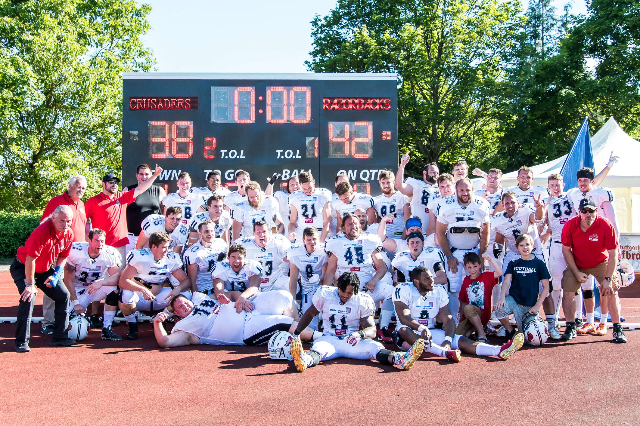 Nach dem ersten Viertel führte Ravensburg mit 21:7, am Ende wurde es eine richtig spannende Angelegenheit. Im vierten Viertel gingen die Crusaders durch den Touchdown von Andreas Teichmann erstmals in Führung (35:28). Lennies McFerren mit einem 30-Yard-Lauf und Kicker Patrick Reinisch glichen für Ravensburg zum 35:35 aus. Rund drei Minuten vor Schluss ließen die Razorbacks keinen Touchdown zu, Albershausen traf aber immerhin das Fieldgoal zum 38:35.