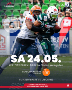 it dem Kickoff um 19 Uhr werden die Razorbacks alles dafür geben, die Gießen Golden Dragons zu besiegen und weiterhin ungeschlagen an der Tabellenspitze zu bleiben. Die Teams kennen sich aus den letzten Jahren, aber es gab diese Saison noch kein Aufeinandertreffen. Die Golden Dragons stehen aktuell mit 2:12 Punkten auf dem vorletzten Tabellenplatz, sind aber definitiv nicht zu unterschätzen. Neben einigen sehr engen Spielen sorgten die Dragons vor allem mit dem hart umkämpften Unentschieden gegen den Tabellenzweiten und engsten Verfolger der Razorbacks, die Saarland Hurricanes, für Aufsehen in der Liga. Damit das den Razorbacks nicht passiert, hat Head Coach John Gilligan seine Jungs intensiv auf das Spiel vorbereitet. Außerdem setzen die Oberschwaben auf ihre Fans. Immerhin sind die Razorbacks inzwischen seit mehr als 2 Jahren Zuhause ungeschlagen und somit kommt kein Gegner gern ins Lindenhofstadion. Eventuell fällt auch hier ein Rekord von über 2000 Zuschauern aus dem letzten Jahr.