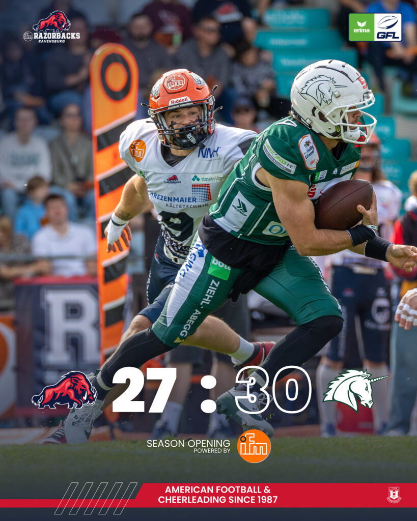 Am Samstagabend sahen über 1.000 Zuschauer im TeleData-Stadion einen packenden Football-Krimi, den die ifm Razorbacks knapp mit 27:30 gegen den…
