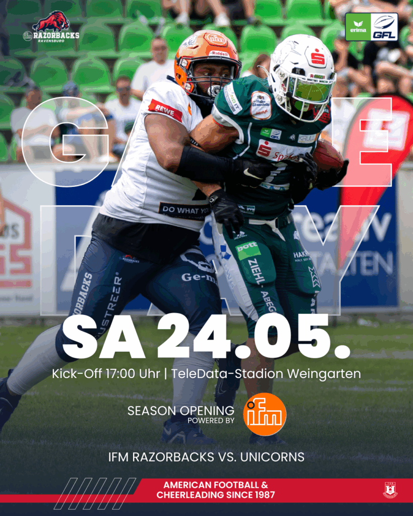 Am kommenden Samstag, 24. Mai 2025, steht für die ifm Razorbacks Ravensburg das erste Heimspiel der ERIMA GFL-Saison an. Im…
