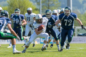 Nach ein paar Specialteam Spielzügen und kurzer Installationsphase wurden in den Positionsgruppen ein paar individuelle Drills gemacht. Im weiteren Verlauf des Trainings wurden dann alle Einheiten immer doppelt gemacht. Die Defense hat ihre Drills, Insideruns, Skelly und Scrimmage immer gegen ein spezielles Offense Scoutteam gemacht und auf der anderen Seite spielte die Offense immer gegen ein Defense Scoutteam, welches vorher entsprechend vorbereitet wurde. Die Starter und direkten Backups spielen also immer ihr Playbook, während die 3. und 4. Reihe in den Scoutteams die Spielzüge des Gegners spielten. Nur so ist es möglich, dass alle Spieler ausreichend Spielzüge bekommen. Die Starter können gegen ein gut vorbereitetes Scoutteam trainieren und die anderen Spieler können sich in den Scoutteams entwickeln und den Coaches zeigen, was sie können.